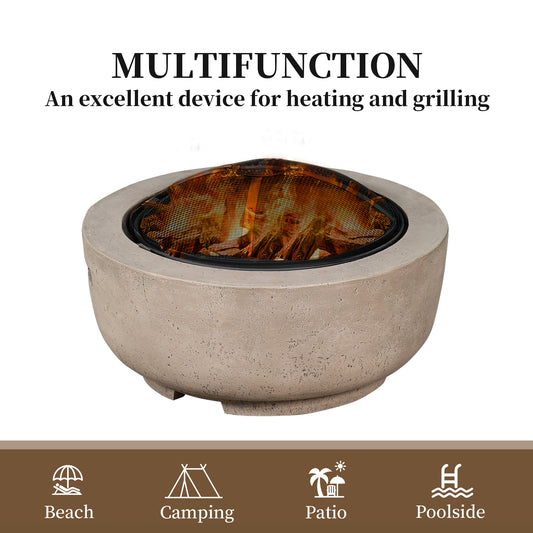 Allwex 23.62'' Round Fire Pit Magnesium Oxide Wood Burning with Spark Screen & Poker for Patio Backyard Garden(Light Brown)